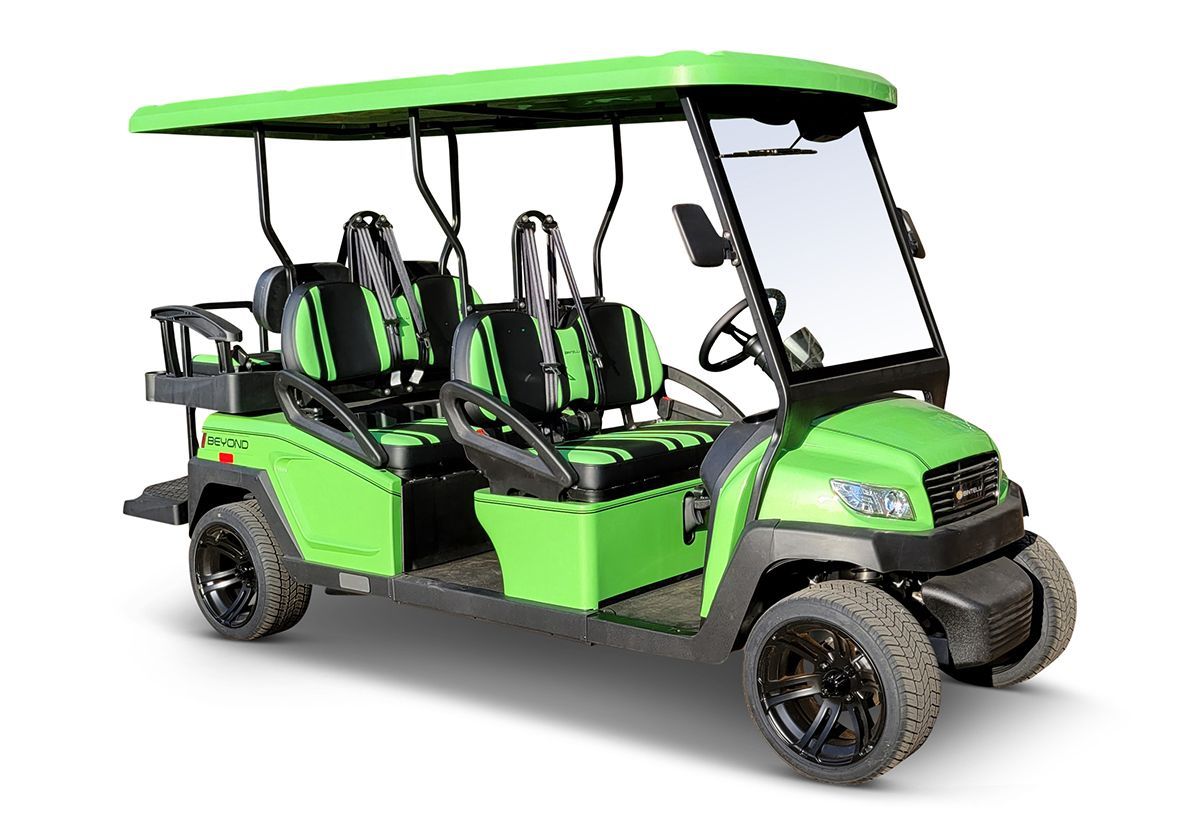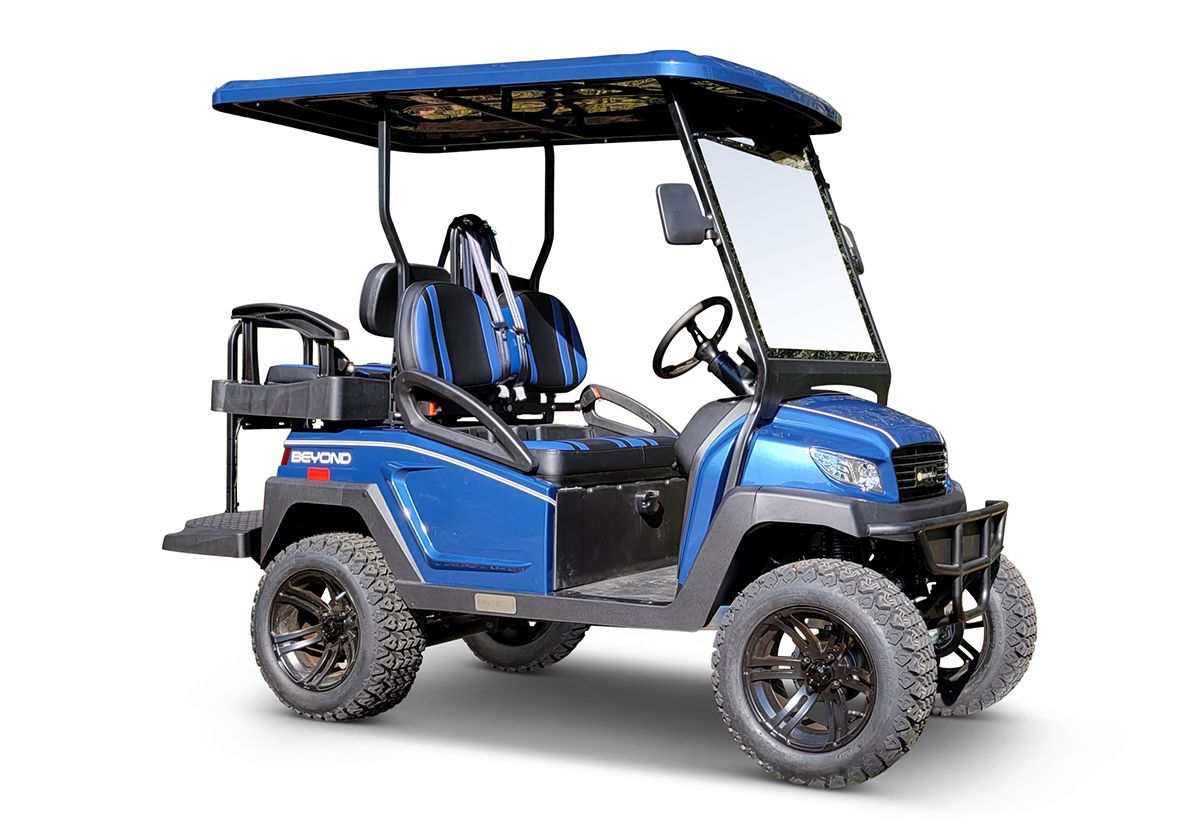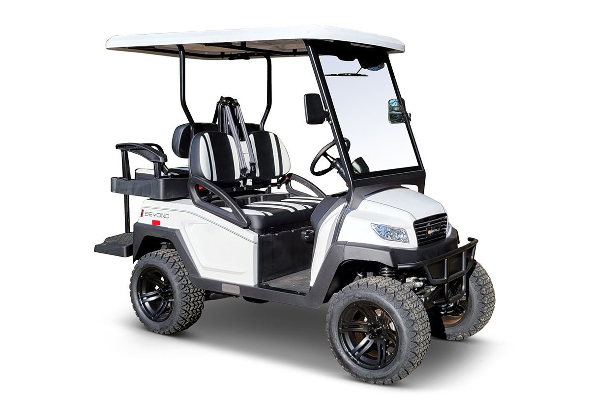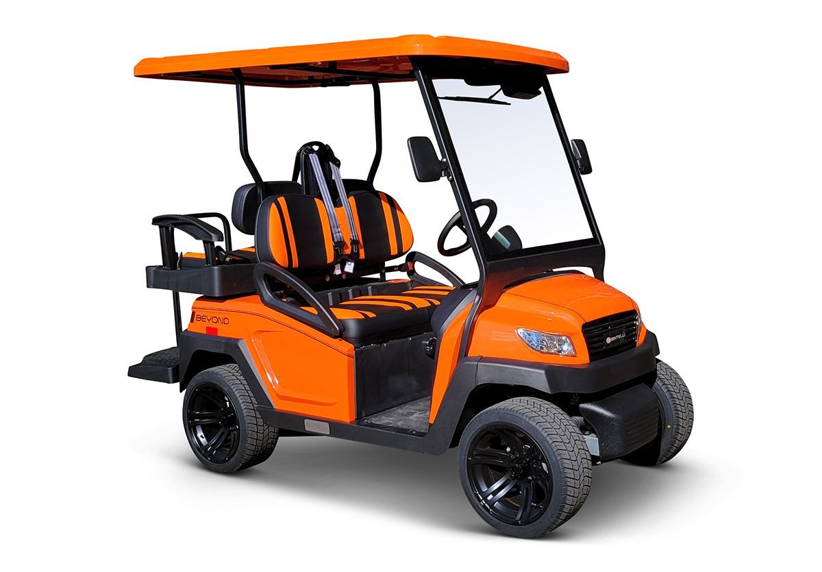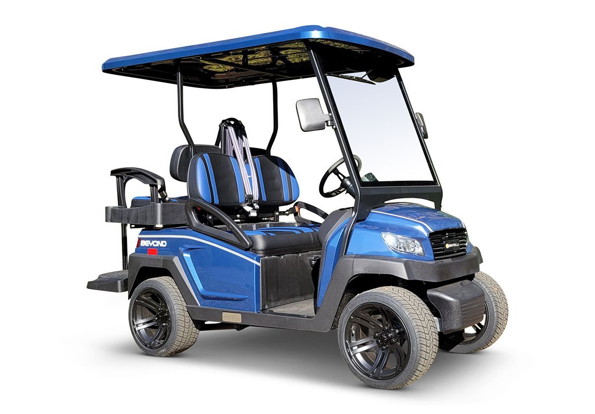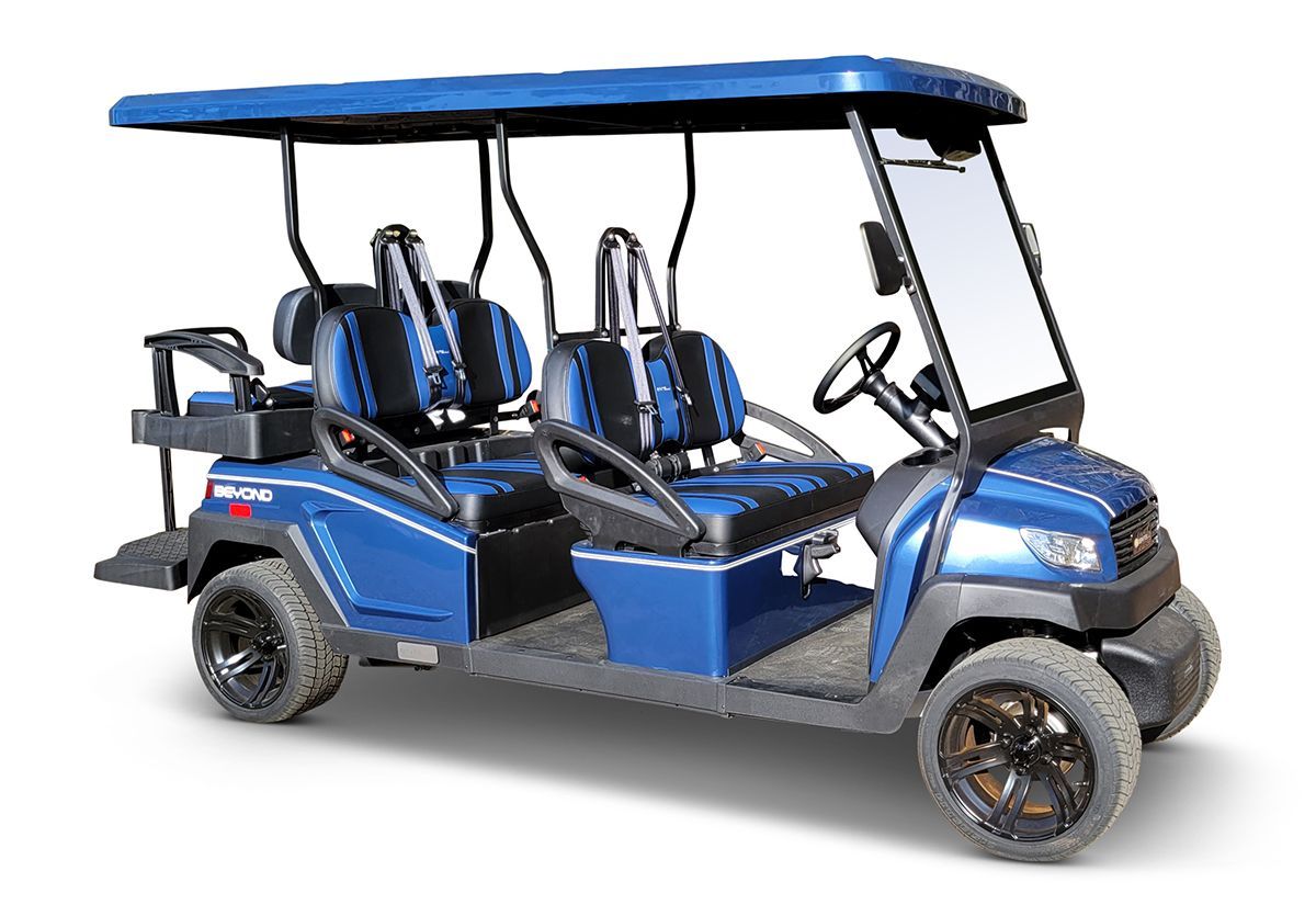 Bintelli Beyond is a street legal golf cart that is the newest addition and fully loaded. Bintelli comes complete with an aluminum frame, aluminum roof supports, AC motor, LED lighting, 14″ wheels, a Bluetooth sound system, reverse camera, hydraulic disc brakes, two-tone premium seats, on-board smart charger, dual USB plugs, extended roof, rear flip seat, head lights, tail lights, turn signals, DOT windshield with wiper, DOT tires, DOT 3-point seat belts, and a 17 digit vin number.